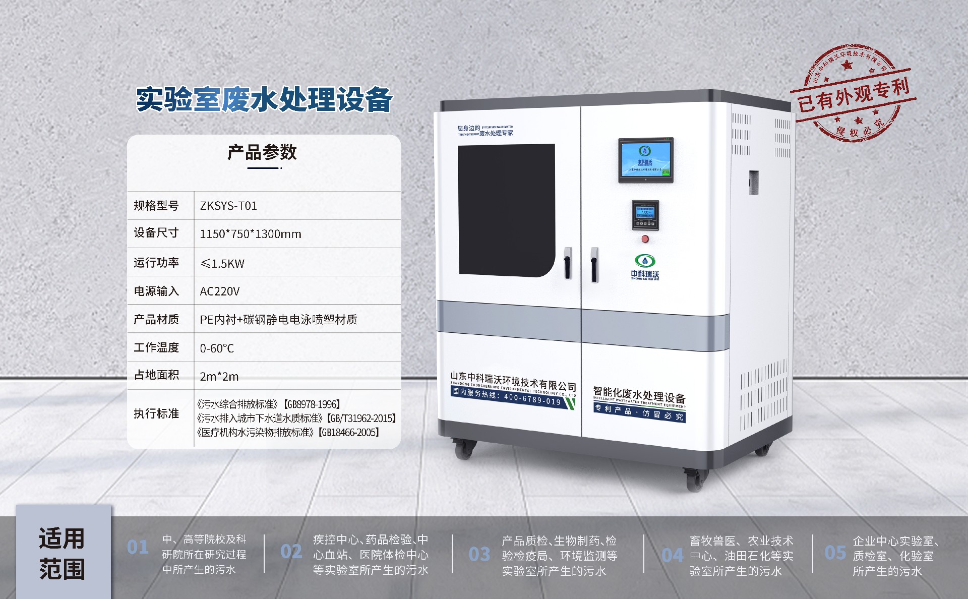 該設(shè)備被廣泛應(yīng)用于中、高院校、科研院所、醫(yī)療機(jī)構(gòu)、生物制藥、疾控中心、環(huán)監(jiān)、產(chǎn)品質(zhì)檢、檢疫檢驗(yàn)、藥品檢驗(yàn)、血站、畜牧、醫(yī)院、石油化工、企業(yè)等實(shí)驗(yàn)室、化驗(yàn)室的綜合廢水處理,憑借穩(wěn)定性能,優(yōu)質(zhì)處理結(jié)果,受到廣大客戶的一直好評(píng)。